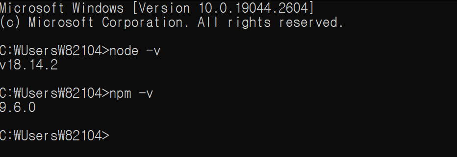 - 정상적으로 설치되었다면 Node, npm version이 커맨드라인에 출력되어야 합니다.