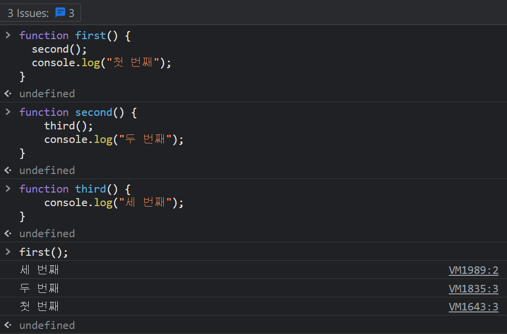 - 우선 위의 코드는 function 키워드로 first(), second(), third() 함수를 선언하였으며 이후에 first() 함수를 호출한 후의 결과를 나타낸 코드입니다.