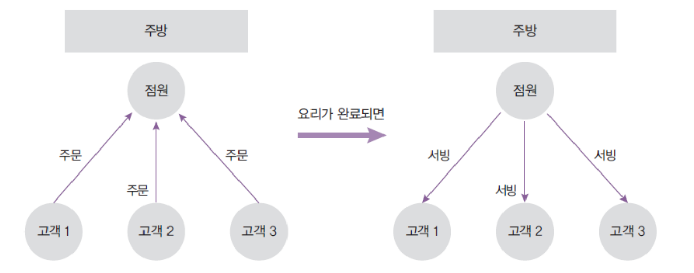 - 마찬가지로 주방과 점원, 고객으로 비유해본다면 점원이 한 손님의 주문을 받고 주방에 주문 내역을 넘긴 뒤 다음 손님의 주문을 받게 되며 주방에서 요리가 완료되면 순서대로 손님에게 서빙합니다. 이 과정에서 주문 순서와 서빙 순서가 일치하지 않을 수도 있습니다.