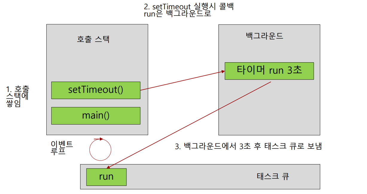 (2) setTimeout()이 실행되면 run() 콜백 함수를 백그라운드로 보내고, 호출 스택에서 빠지게 되며 이후 main() 함수도 호출 스택에서 빠지게 됩니다.