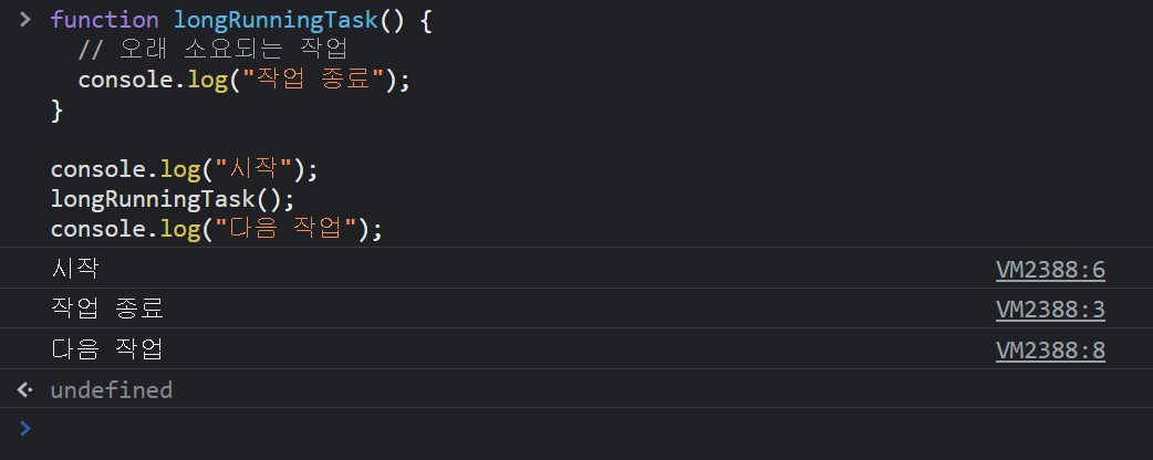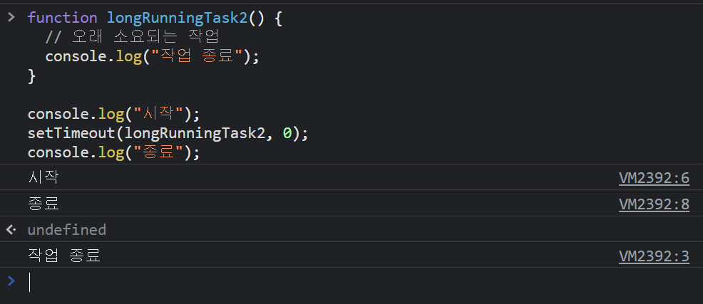 - 해당 함수를 사용하면 이벤트 루프 처리에 의해 setTimeout()의 콜백 함수 longRunningTask2()가 태스크 큐로 이동되므로 순차적으로 실행되지 않는다는 것을 이해할 수 있습니다.