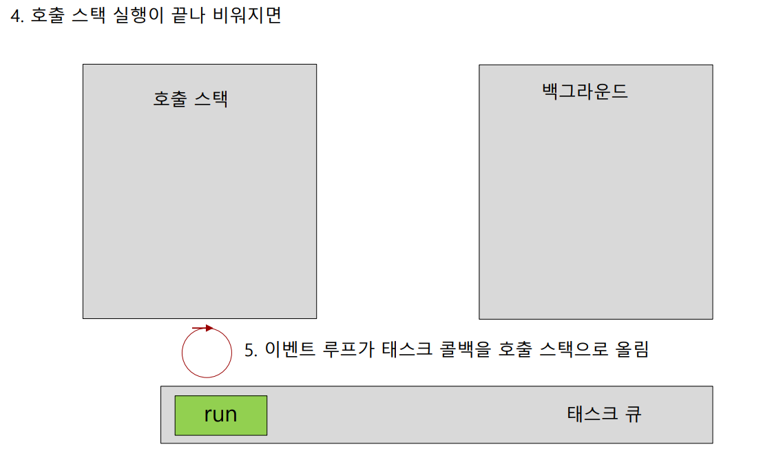 (5) 호출 스택에 함수가 존재하지 않으므로 이벤트 루프는 이때 태스크 큐에 존재하는 콜백 함수를 호출 스택으로 이동시킵니다.