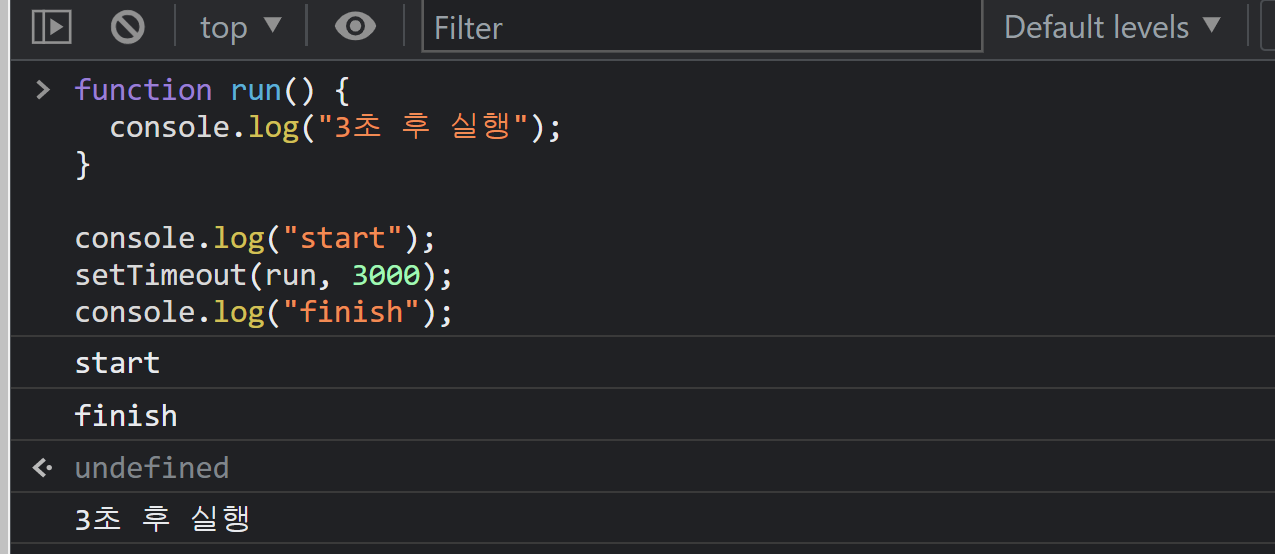 - Java, C++와 같은 프로그래밍 언어를 학습하신 분들이 이 코드를 본다면 위와 같은 수행 결과를 납득하기 어려우실 수도 있습니다. 순차적으로 실행되어야 한다면 "start → 3초 후 실행 → finish"가 확인되어야 하나 전혀 다른 결과가 발생했기 때문입니다.