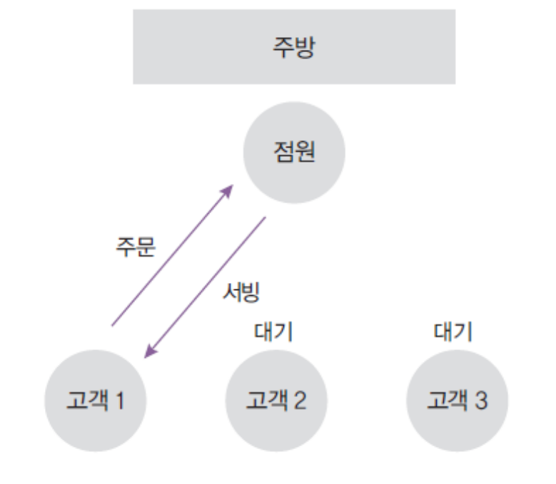- 식당에서의 점원과 고객으로 비유한다면, 점원이 한 손님의 오더를 받아 주방에 넘기고 주방에서 요리가 나온다면 해당 고객에게 서빙을 합니다. 이후에 다음 손님의 주문을 받는 방식으로 매우 비효율적입니다.