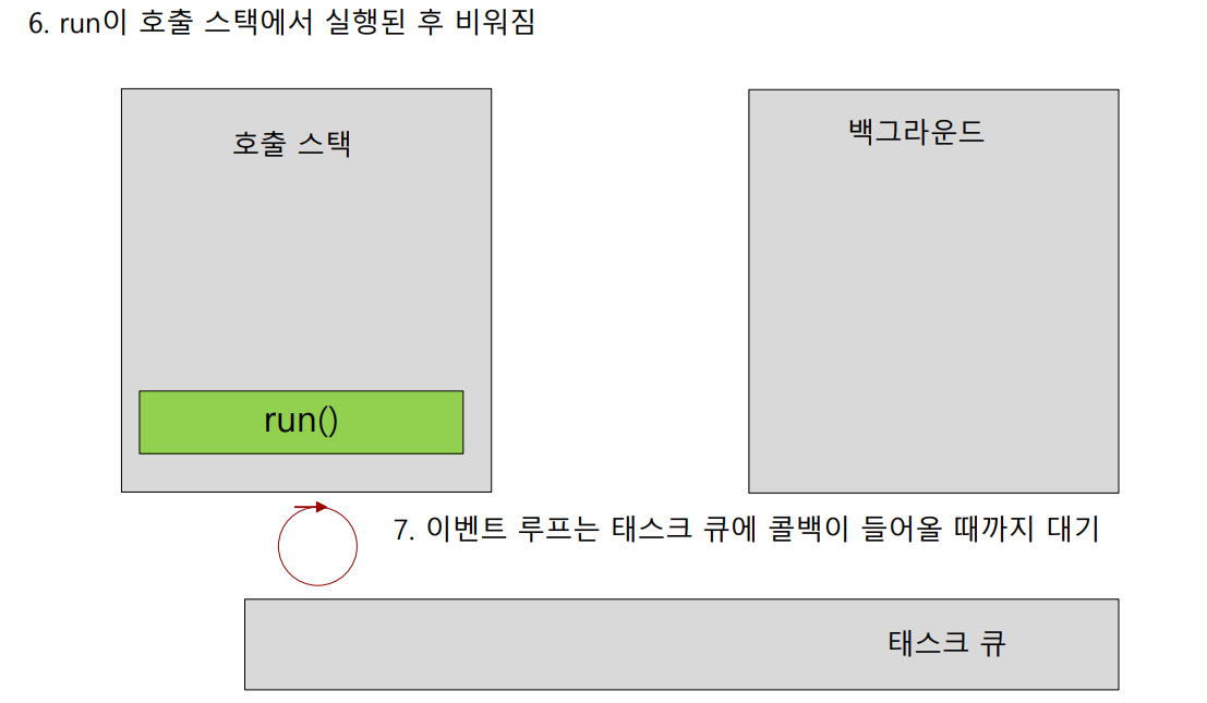 (6) 호출 스택으로 이동된 run() 함수가 실행되고 실행이 완료되면 호출 스택에서 사라지게 됩니다.