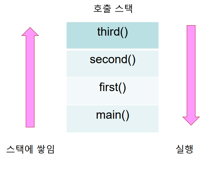 - main() 함수가 먼저 실행되고 main() 함수에서 first() 함수를 호출한 뒤, first() 함수 내부의 second() 함수가 호출된 뒤 second() 함수 내부의 third() 함수가 실행됩니다.