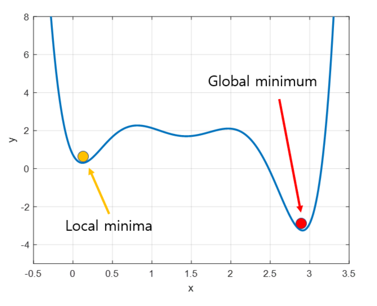 - 실제로 최적의 파라미터를 찾기 위해 Global minimum을 찾아야 하지만, 경사 하강법의 특성상 알고리즘이 시작되는 파라미터 위치가 랜덤이므로 특정한 경우에서 Local minima에 빠지게 되어 헤어나오지 못하는 상황이 발생할 수도 있게 됩니다.