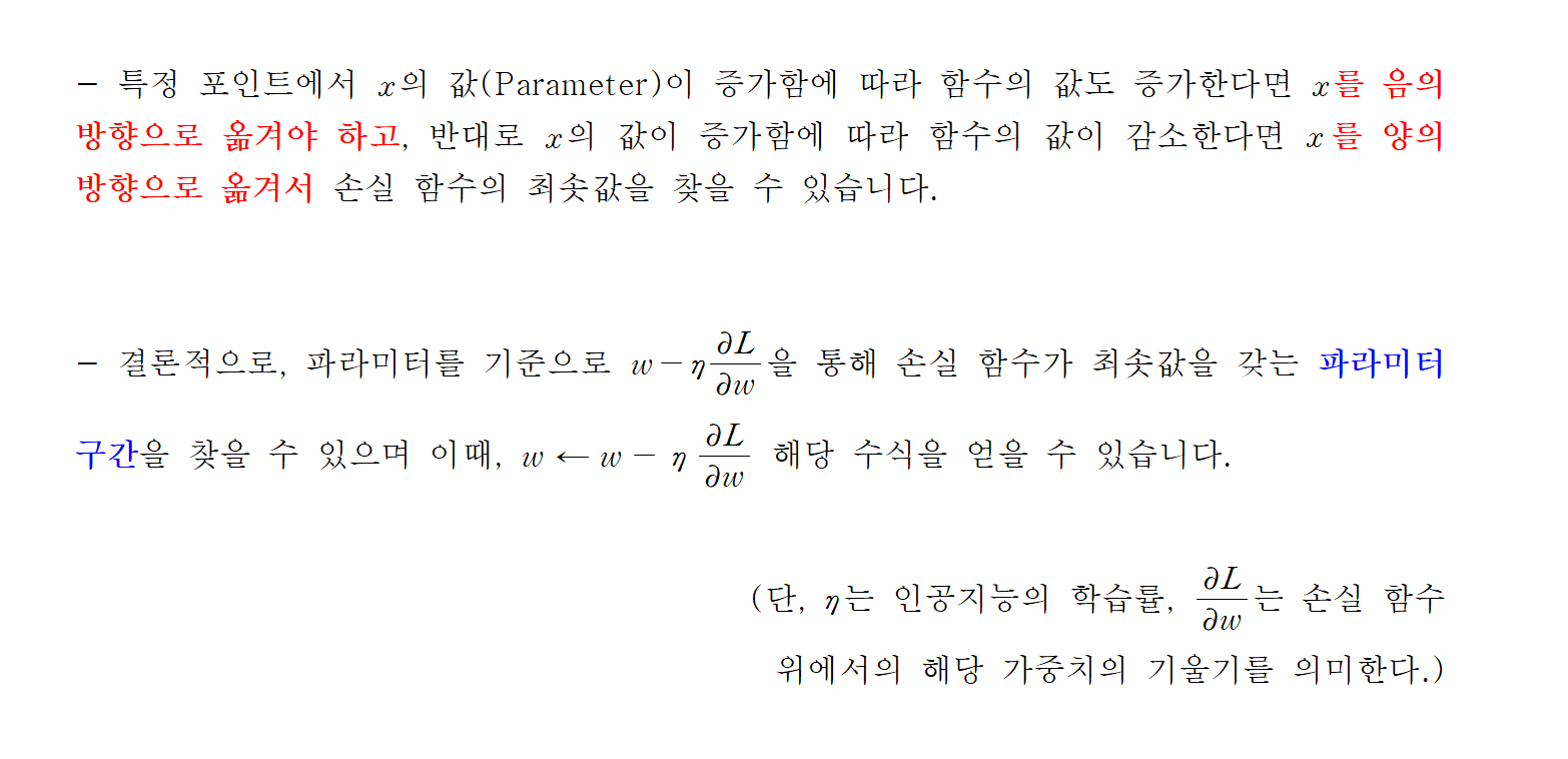 - 여기서 생각해야 할 점은, 기울기에 대한 파라미터만을 가지고 해당 파라미터에 대해 손실 함수의 최솟값이 존재하는지 보장할 수 없습니다. 단, 해당 방향으로 손실 함수의 값이 줄어드는 것은 확정적이므로 결론적인 최솟값을 찾기 위해서는 구한 기울기의 정보로 나아갈 방향을 탐색해야 합니다.