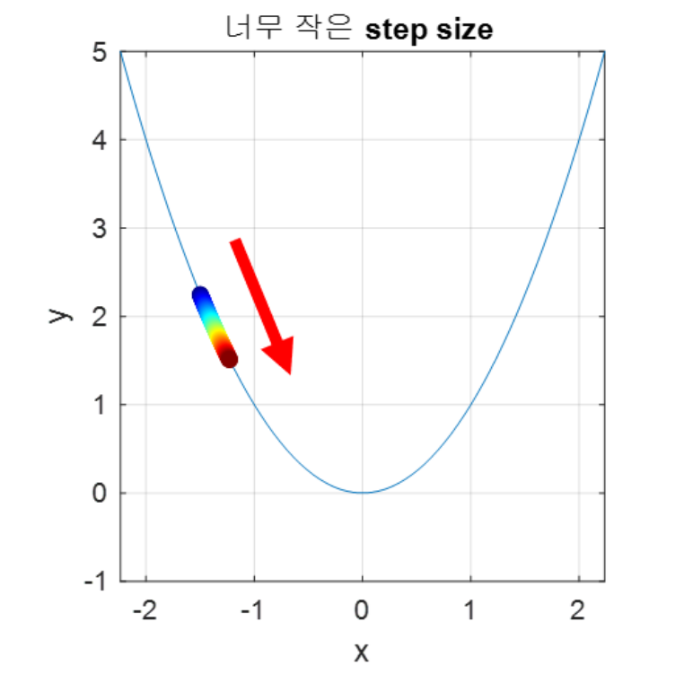 - 이번엔 Step size가 너무 작게 설정된 경우 발산하지 않을 수 있다는 점이 있지만, 최적의 파라미터를 탐색할 때 소요되는 시간이 다소 오래 걸릴 수 있다는 단점이 존재하게 됩니다.