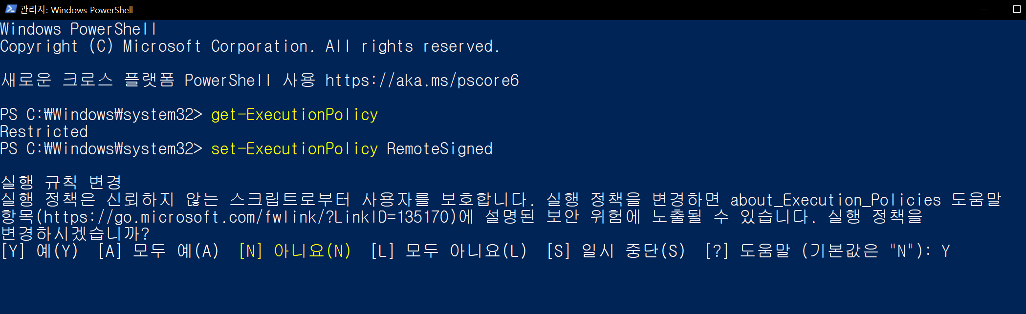 (6) 실행 정책을 바꾸기 위한 안내 메시지가 출력되며 Y를 입력하여 권한을 변경합니다.