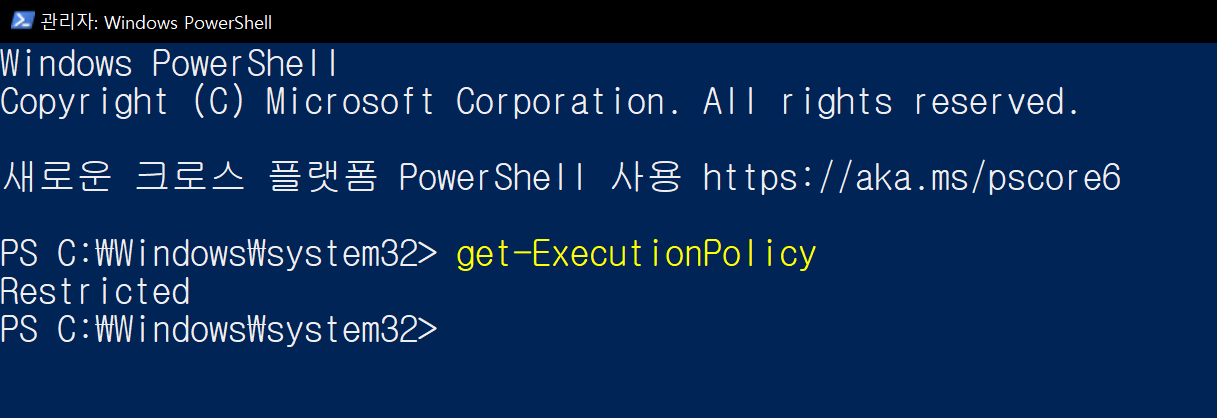 | Restricted | 기본(Default) 설정 값으로, 스크립트 파일을 실행할 수 없는 상태 (기존 상태) |