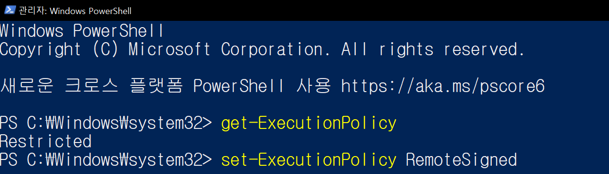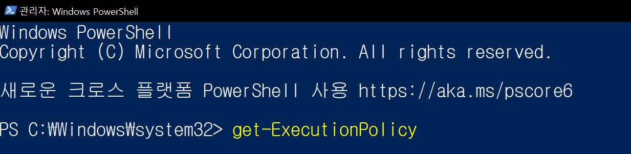 - 실행 정책이 정상적으로 변경된 것을 확인할 수 있습니다.