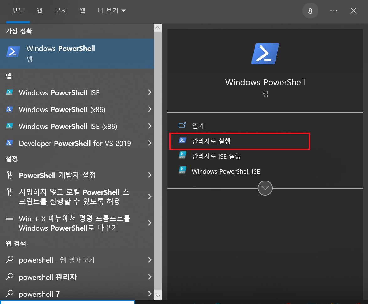 (1) Windows 10 기준으로 Linux 기반의 Windows PowerShell을 관리자 권한으로 실행시킵니다.