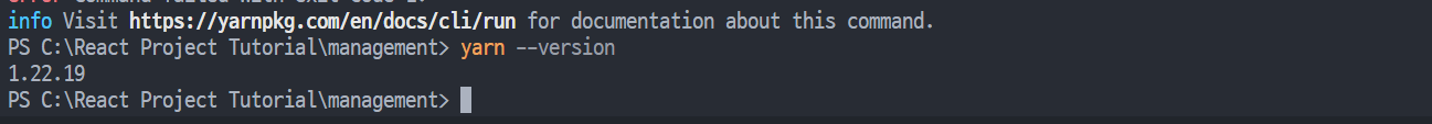 (8) 재실행 결과 : VSCode Terminal에서 yarn 커맨드가 정상적으로 실행되는지 확인합니다.