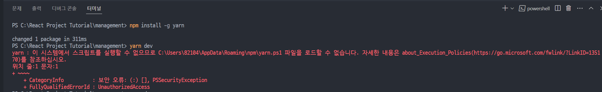 - VSCode와 같은 코드 편집기의 Terminal을 이용하여 npm 또는 yarn 계열 커맨드를 사용하는 경우 만약 처음 사용하는 환경이라면 터미널에서 아래와 같은 오류 메시지가 출력될 수 있습니다.