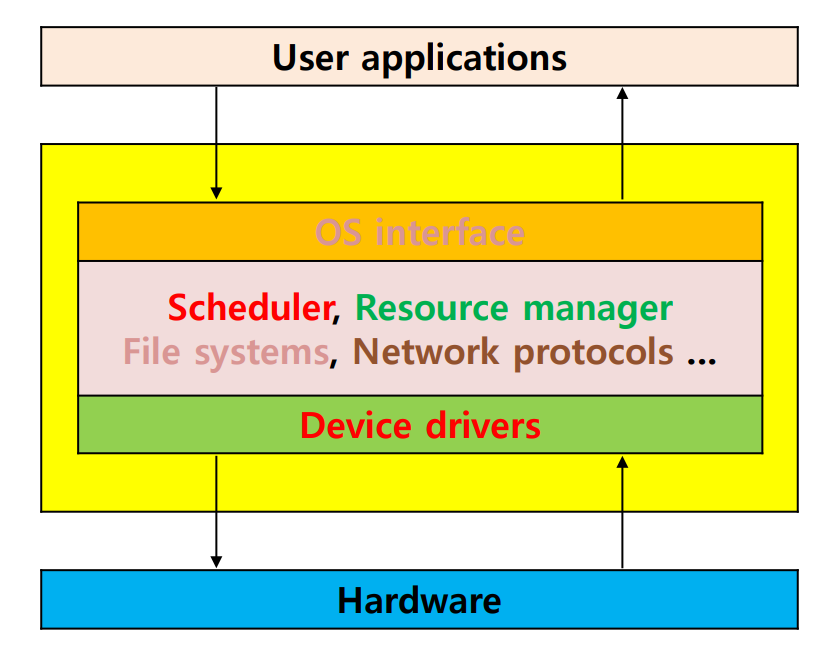 - 운영체제의 커널이 모든 기능을 포함하고 있는 커널 아키텍처입니다.