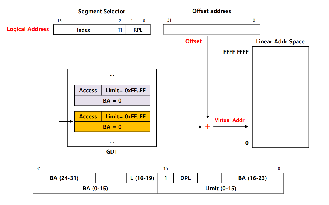 - 그 다음 각 selector는 동일한 sement를 가리킵니다. (코드, 데이터 및 스택이 동일한 segment를 공유하도록 함.)