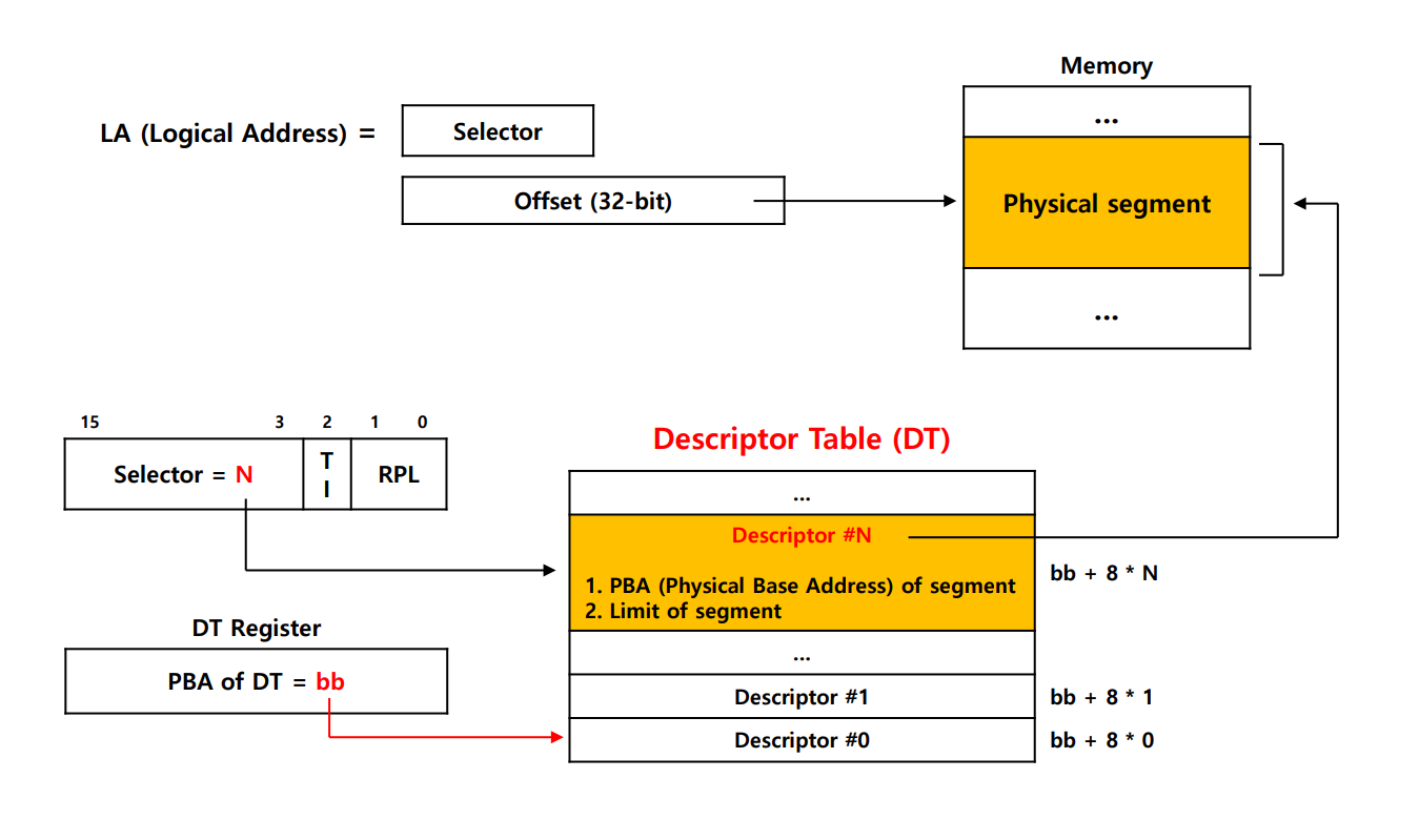- Protected mode에서 segment register는 DT의 특정 엔트리를 지정하는 역할로 변경됩니다.