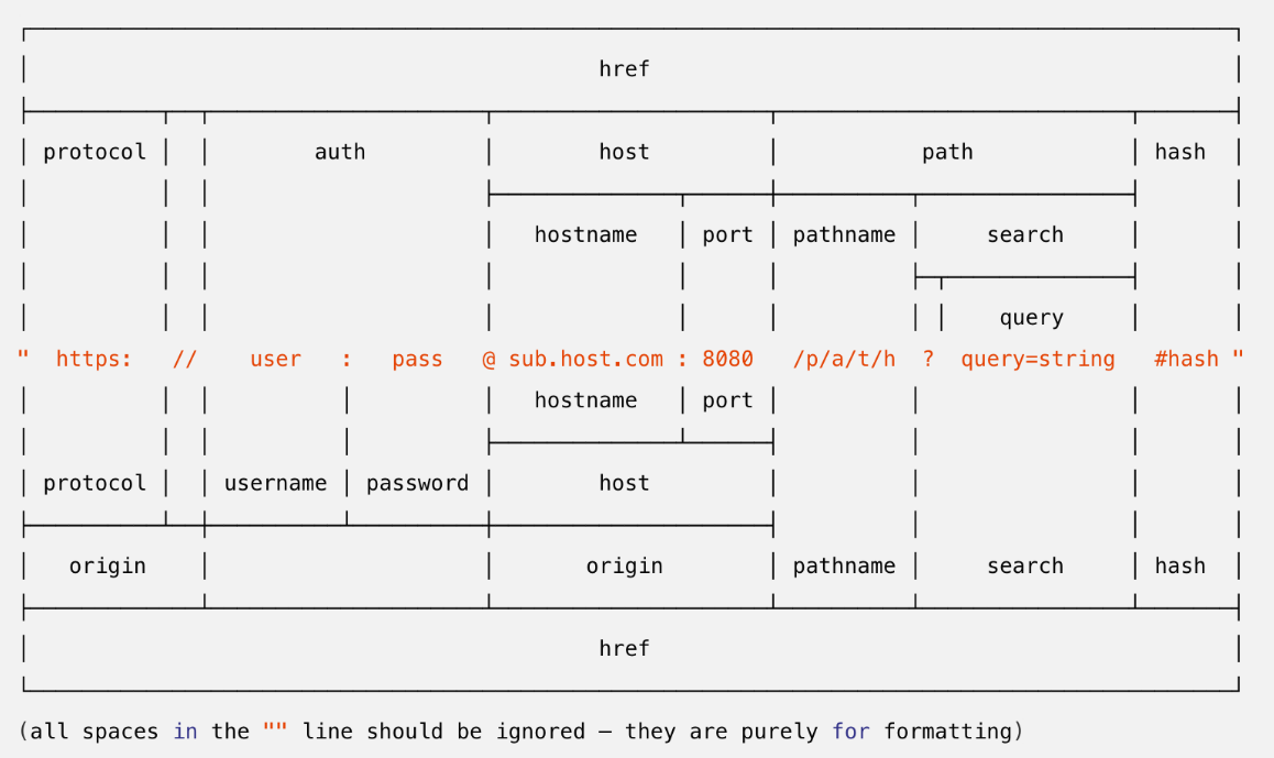 - 말 그대로 주소를 분해하며 WHATWG 방식과 비교해 본다면, WHATWG 방식에서 존재하는 username, password 대신에 기존 노드 방식에선 auth 속성이 존재합니다.