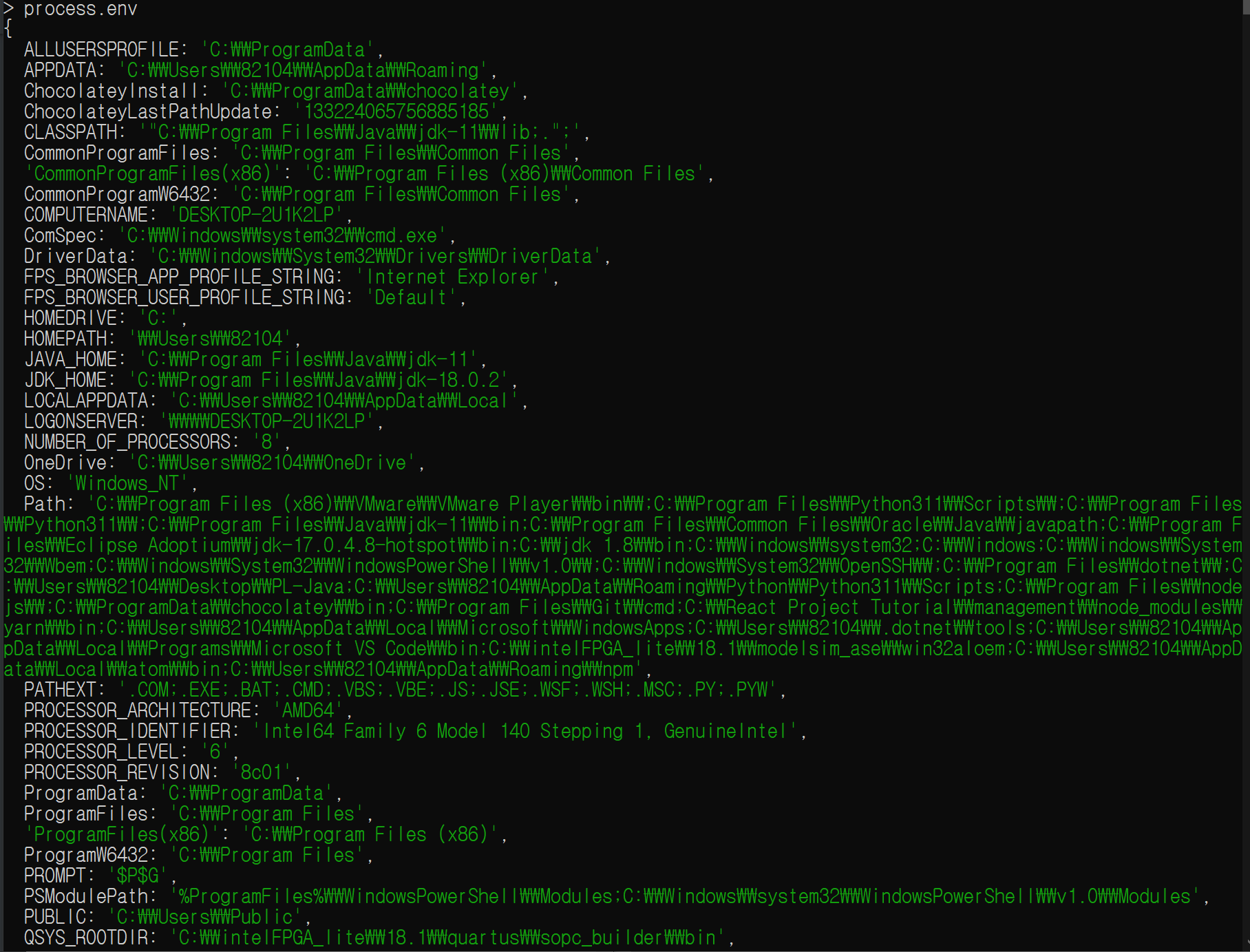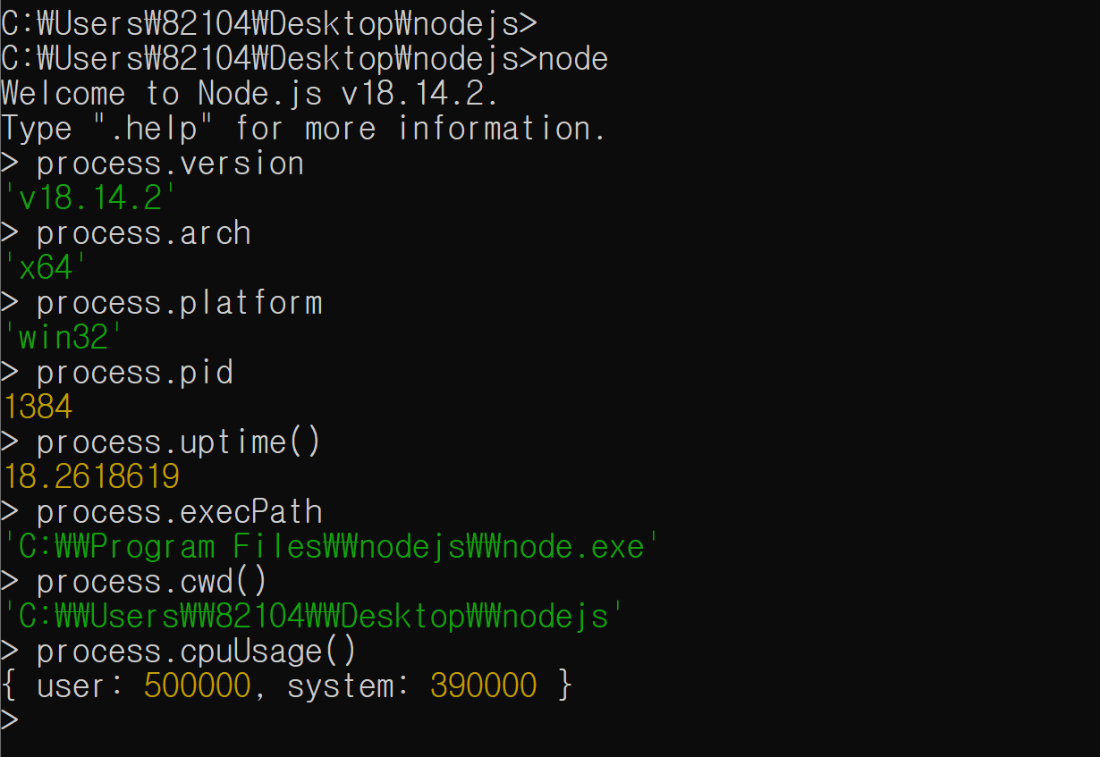 - process 객체는 전역 객체이므로 require() 없이 사용할 수 있고, 해당 객체는 Node의 프로세스에 대한 정보를 제공하고 이를 제어할 수 있도록 하는 객체입니다.