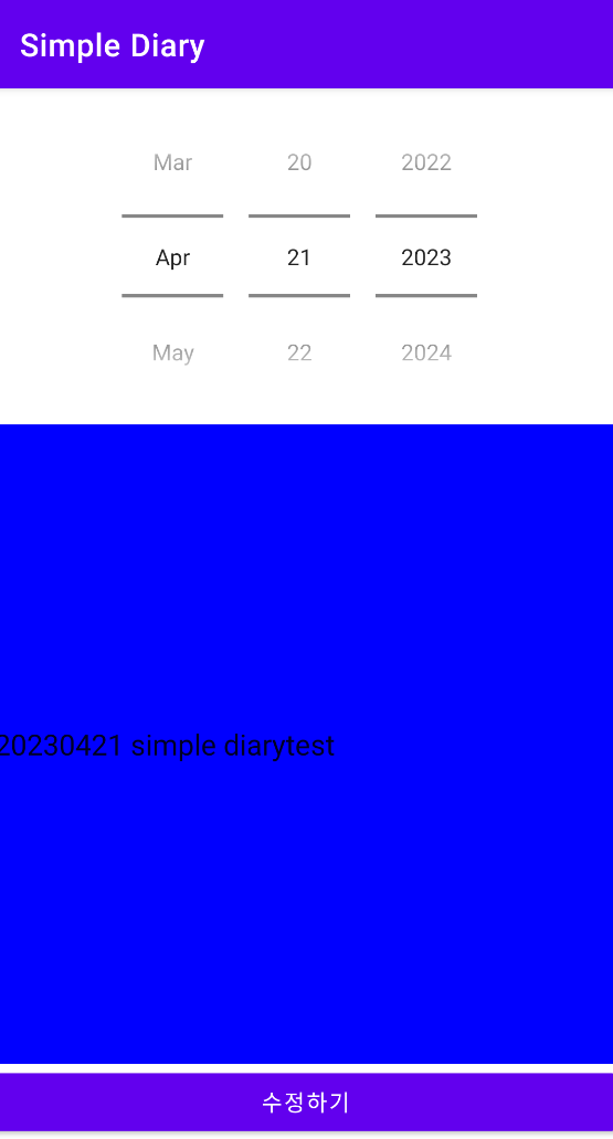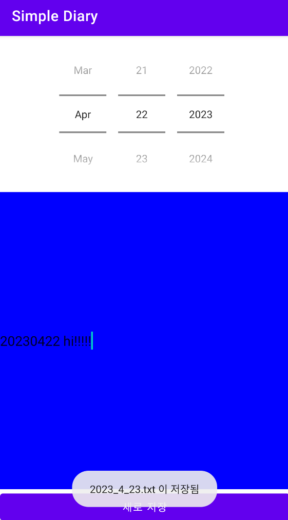 - 2023년 4월 21일에 내용을 작성했기 때문에 날짜를 바꿔보면 EditText 영역에 읽어들여진 텍스트가 출력됩니다.