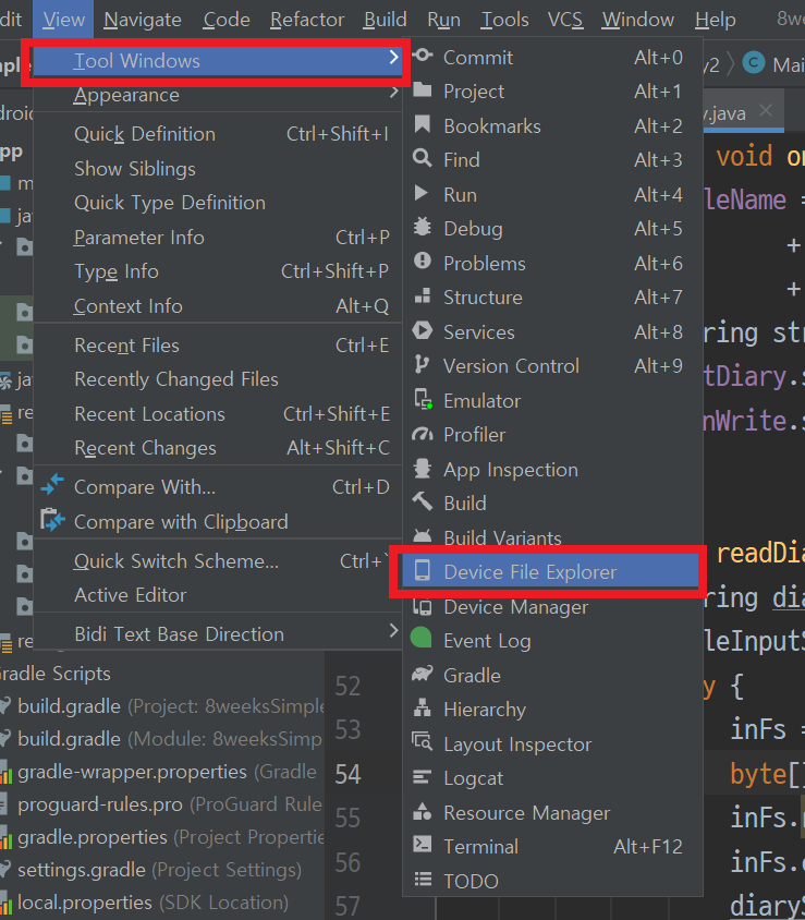 (1) Android Studio 최상단 메뉴 View → Tool Windows → Device File Explorer 메뉴를 클릭합니다.