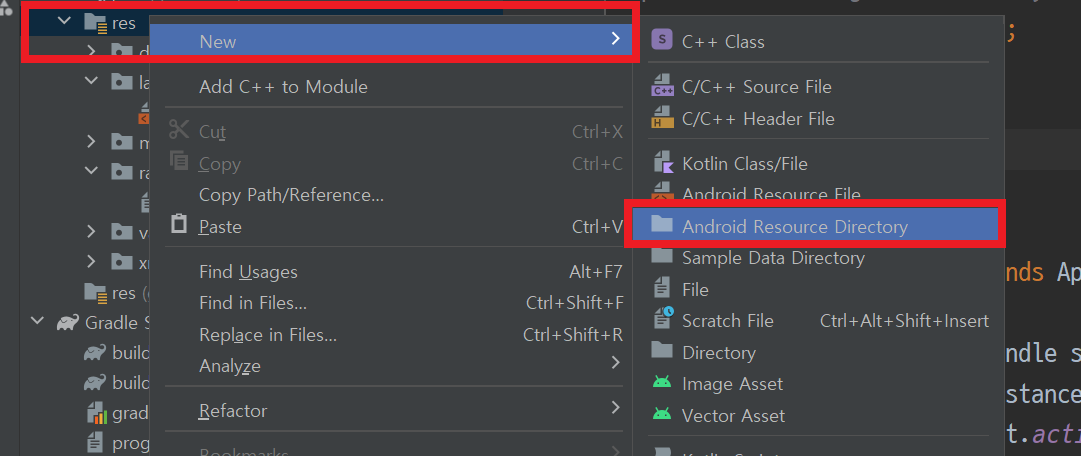 - 프로젝트 디렉토리 경로에서 res 디렉토리 기준 마우스 우측 클릭