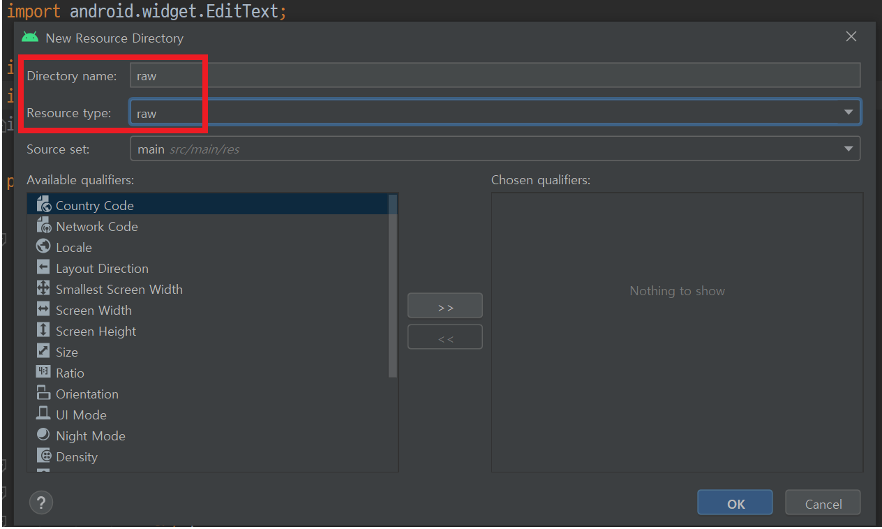 - New → Android Resource Directory → Resource type은 raw, Directory name까지 raw로 설정합니다.