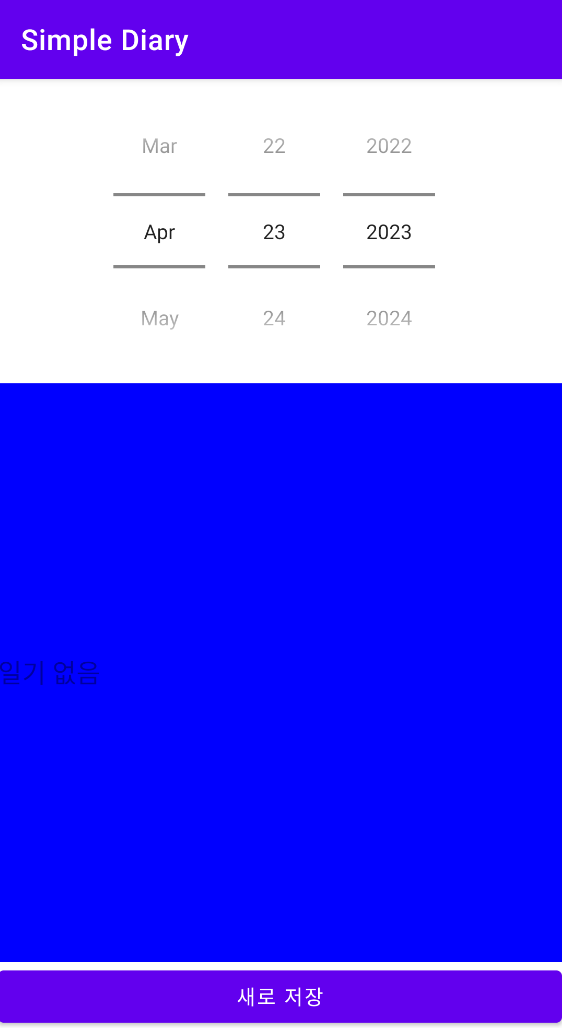 - 선택한 날짜에 일기가 없다면 EditText 영역에 "일기 없음" 문구가 노출되고 맨 하단의 버튼이 "새로 저장"으로 변경됩니다.