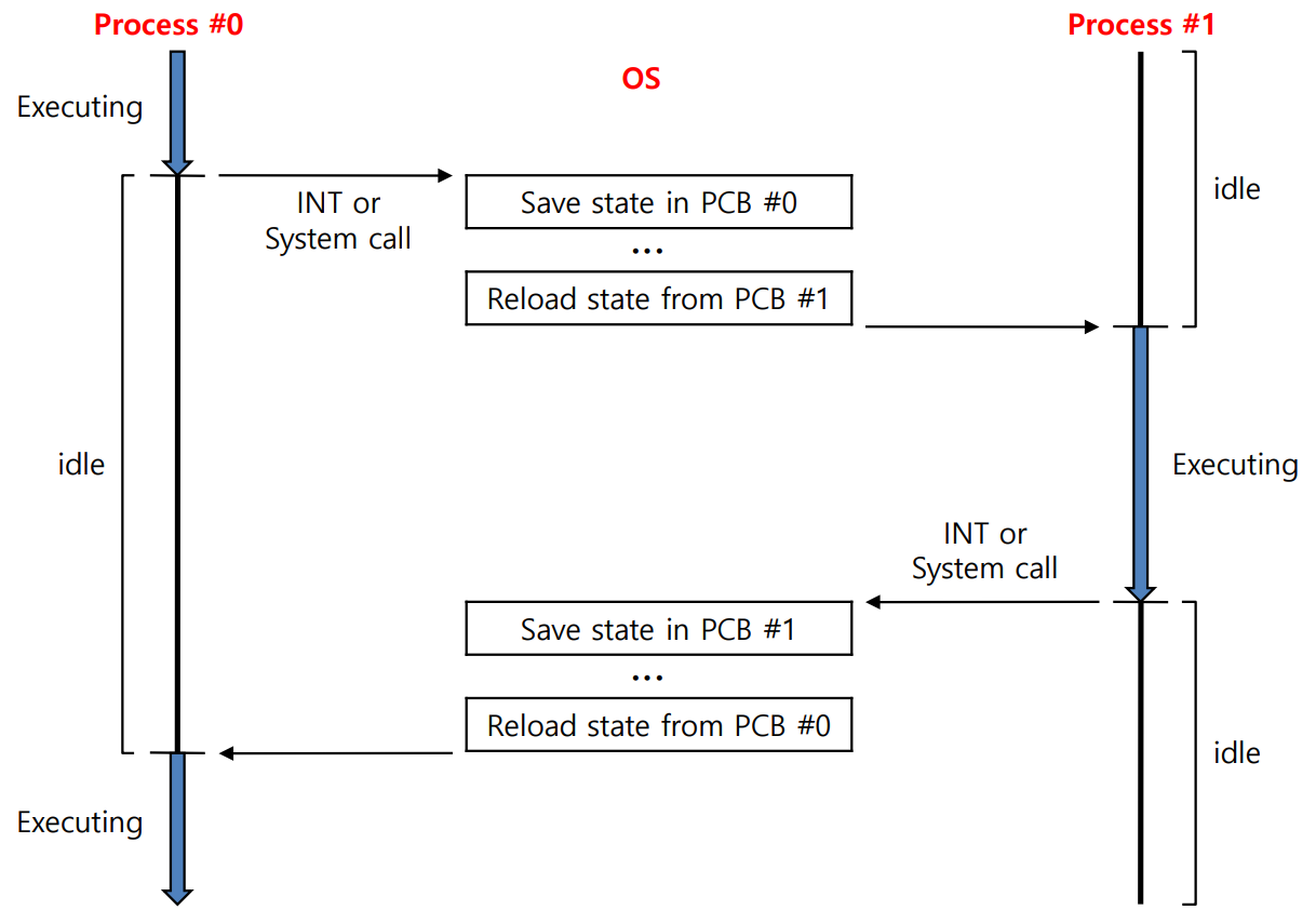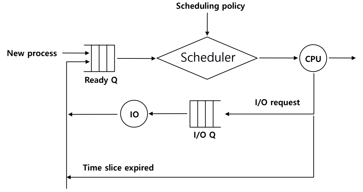 - 할당된 CPU Time이 모두 끝나거나 I/O request로 큐(Queue)에 대기하게 되면 CPU를 다른 프로세스에게 넘겨주게 됩니다.(Interrupt에 의해 진행)
