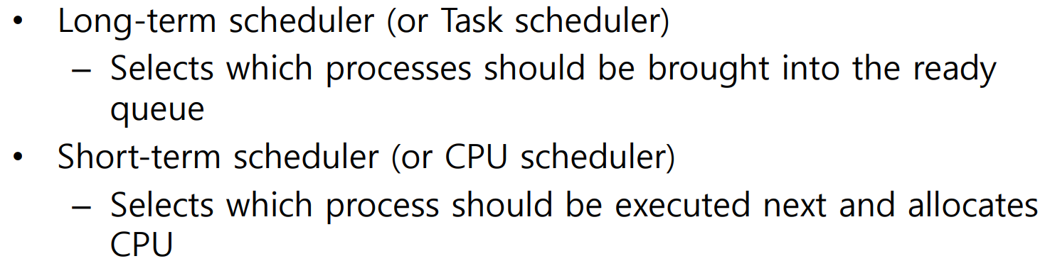 - 스케줄러는 Ready queue에 대기하고 있던 프로세스 중 하나를 선택하고 CPU를 할당합니다.