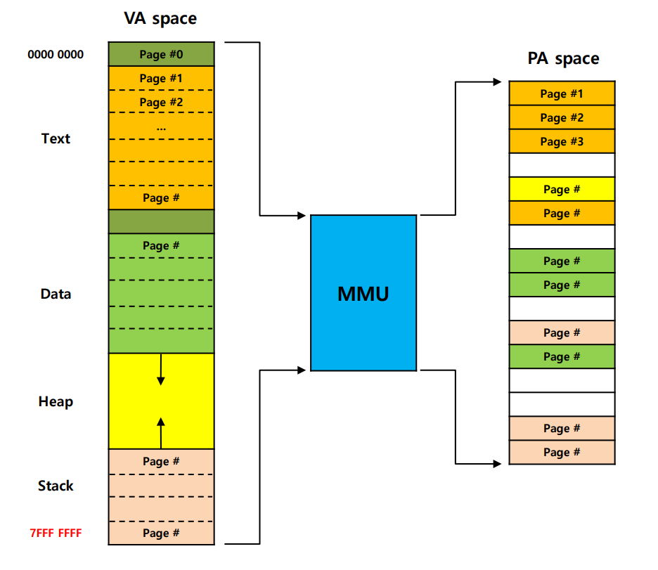 (1) 이렇게 page 단위로 할당된 영역들은 MMU(Memory Management Unit)에 의해 물리 메모리 영역에 page 단위로 할당됩니다.