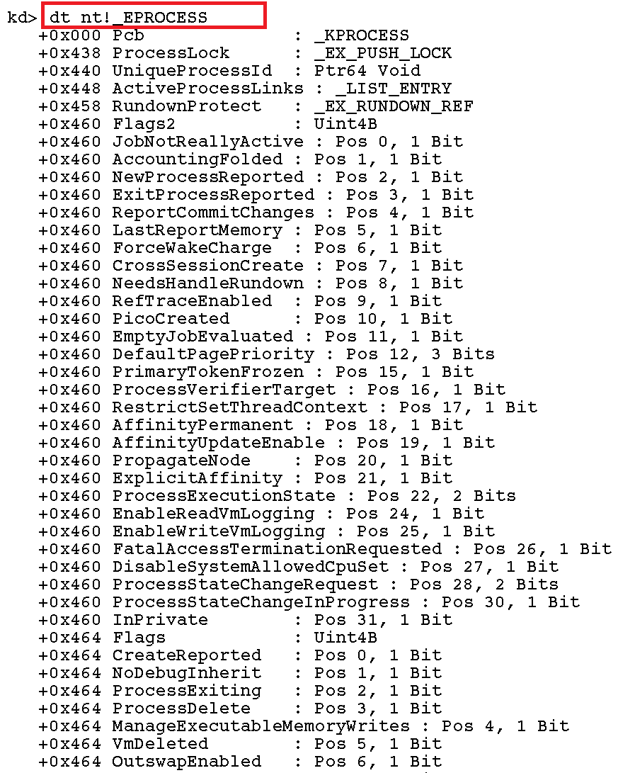(2) WinDbg를 통해 확인한다면, kd> dt nt!_EPROCESS 커맨드로 확인할 수 있습니다.