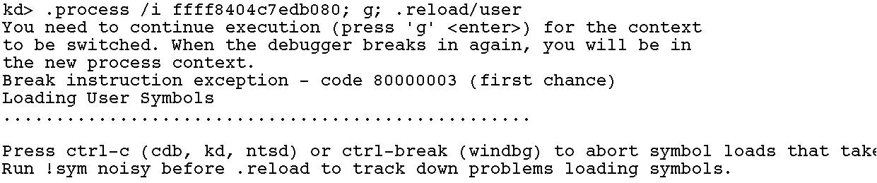 (3) kd> .process /i ffff8404c7edb080; g; .reload/user