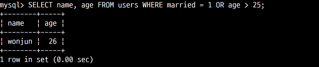 SELECT name, age FROM users WHERE married = 1 OR age > 25;