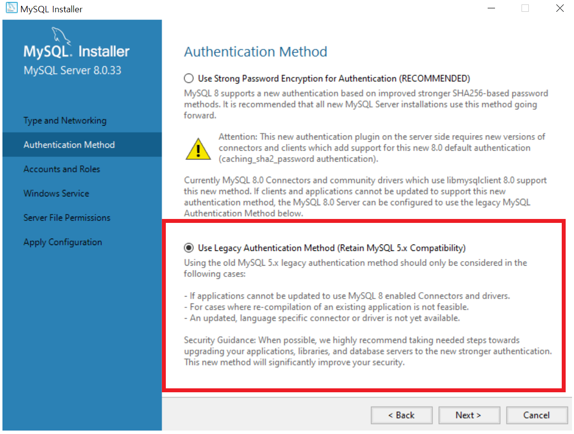 (5) Authentication Method 페이지에서 2번 째 체크 타입인 Legacy Authentication Method 항목을 선택합니다.