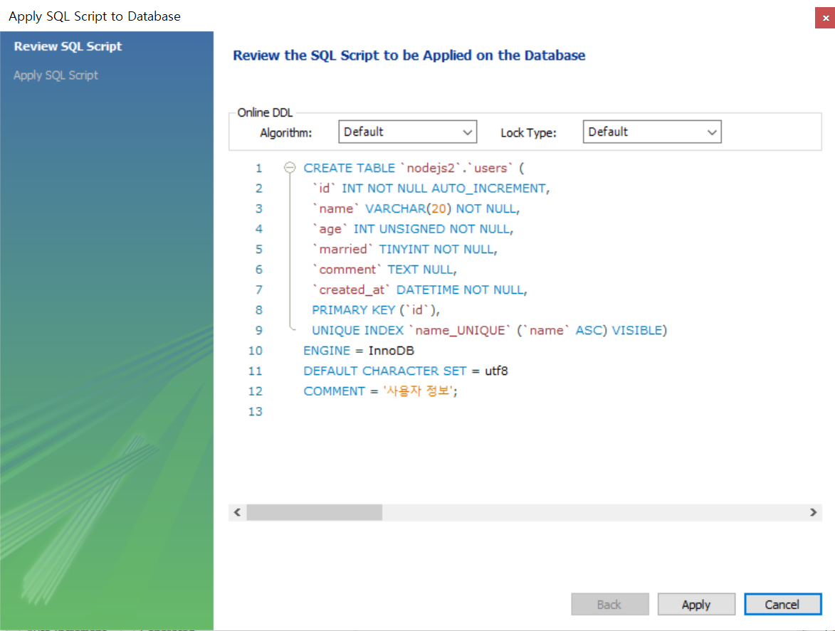 (2) 마지막으로 Apply SQL Script to Database 페이지에서 적용될 속성들을 확인하고 Apply를 누릅니다.
