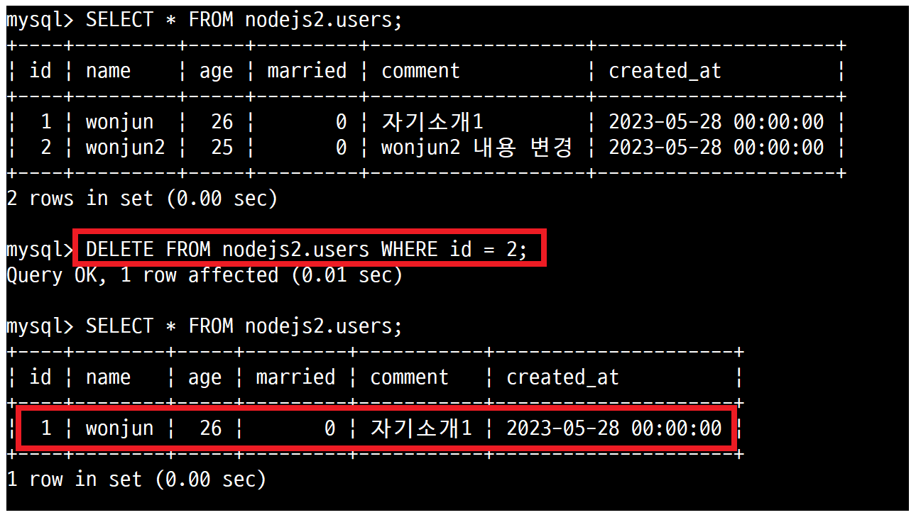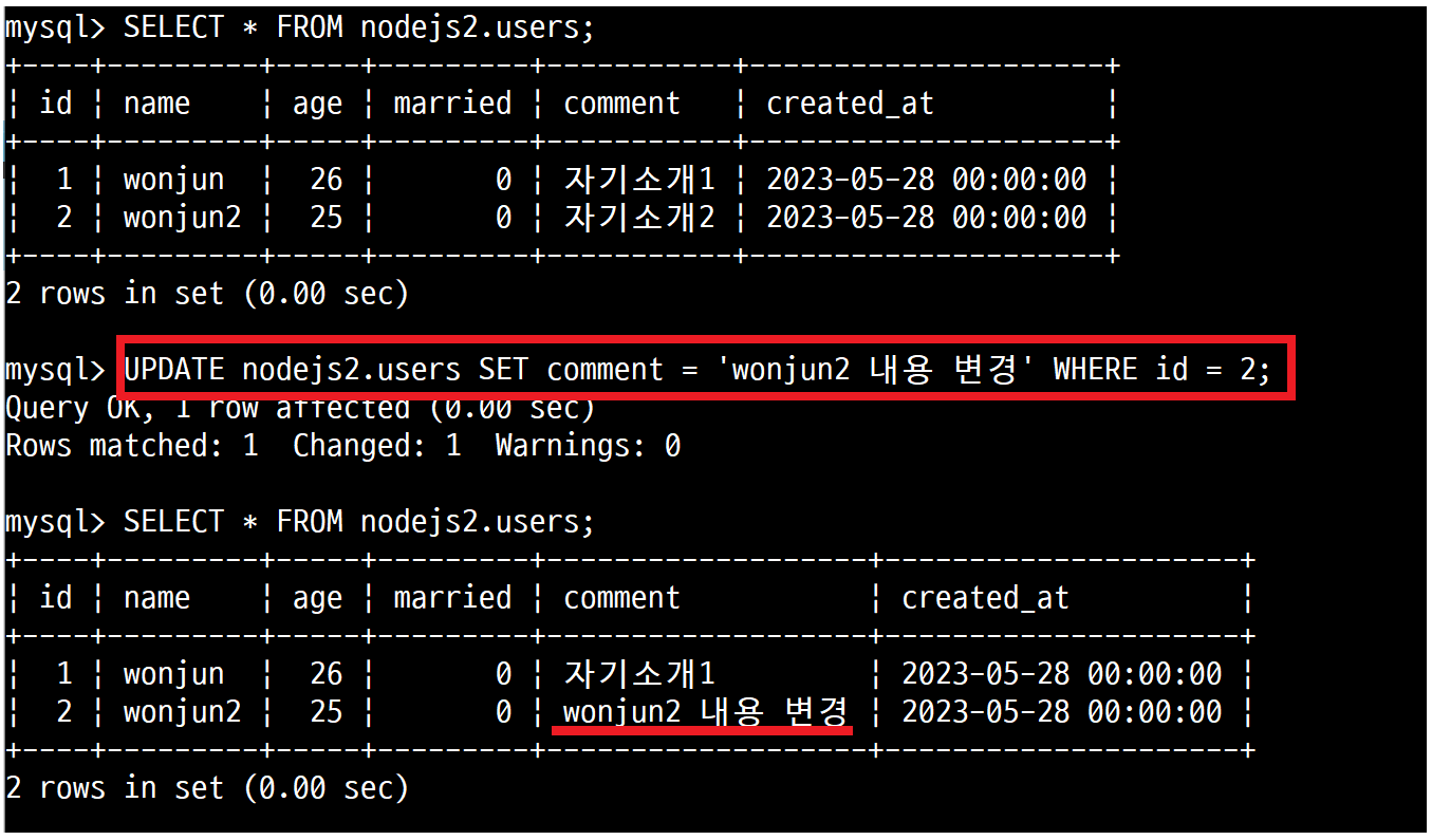 UPDATE nodejs2.users SET comment = 'wonjun2 내용 변경' WHERE id = 2;