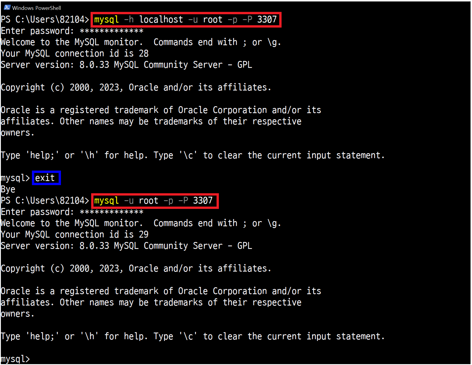 2-2. Windows 기준 Command prompt 또는 Powershell에서 MySQL 접속하기