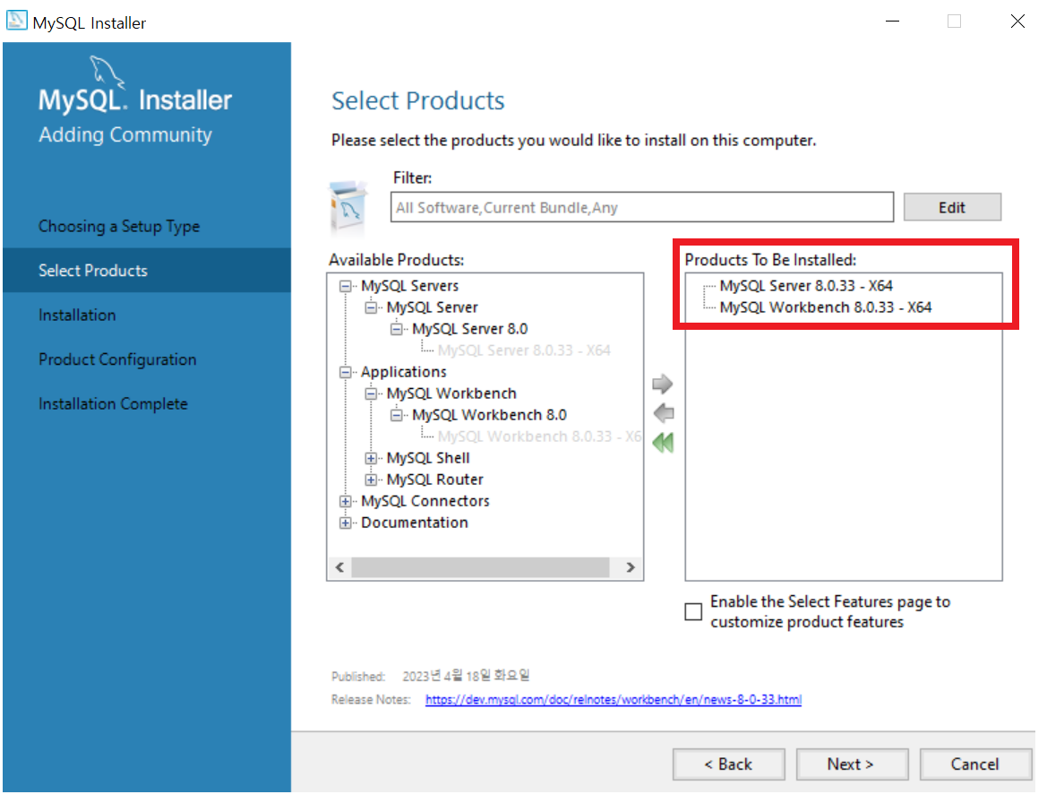 (3) Available product 항목에서 MySQL Server, Workbench를 선택하고 Next를 클릭합니다.