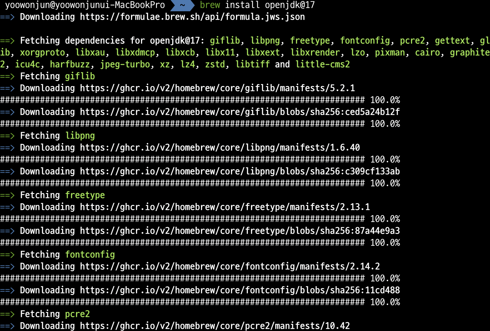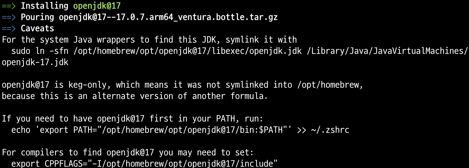 (1) 터미널을 열고 brew install openjdk@17 커맨드를 실행합니다.