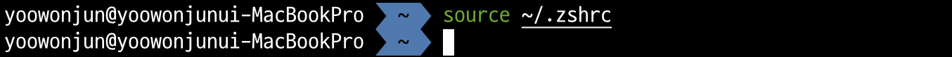 (5) 위와 같이 환경변수를 설정해 주고 에디터를 저장하고 종료한 다음, source ~/.zshrc 커맨드로 변경사항을 적용시킵니다.