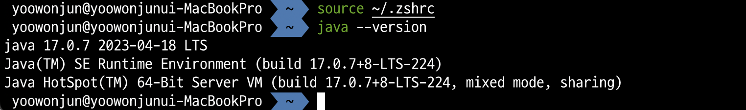 - 확인 시 Java 버전이 17로 변경된 것을 확인할 수 있습니다.