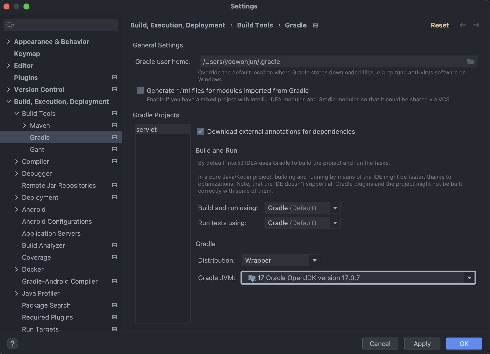 (2) IntelliJ를 실행해서 Preference(Settings) → Build, Execution, Deployment → Gradle Projects 경로에서 Gradle JVM 항목을 Java 17로 변경합니다.
