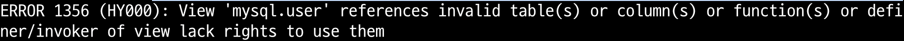 ERROR 1356 (HY000): View 'mysql.user' references invalid table(s) or column(s) or function(s) or definer/invoker of view lack ri