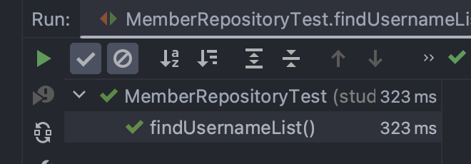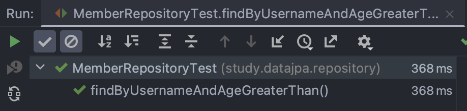 (2) MemberRepositoryTest 클래스에서 동일하게 findByUsernameAndAgeGreaterThan() 메서드에 대한 테스트 케이스를 작성해서 테스트를 진행해봐도 앞선 테스트와 동일한 결과를 얻을 수 있다.