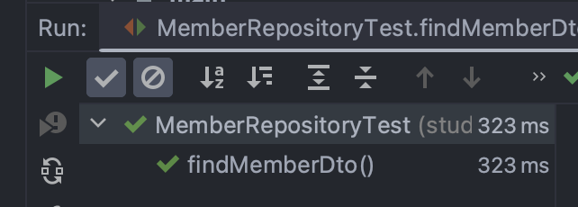 (4) MemberRepositoryTest 테스트 클래스에 DTO 객체를 조회하기 위한 findMemberDto() 메서드가 정상적으로 동작하는지 확인하기 위한 테스트 케이스를 작성한다.