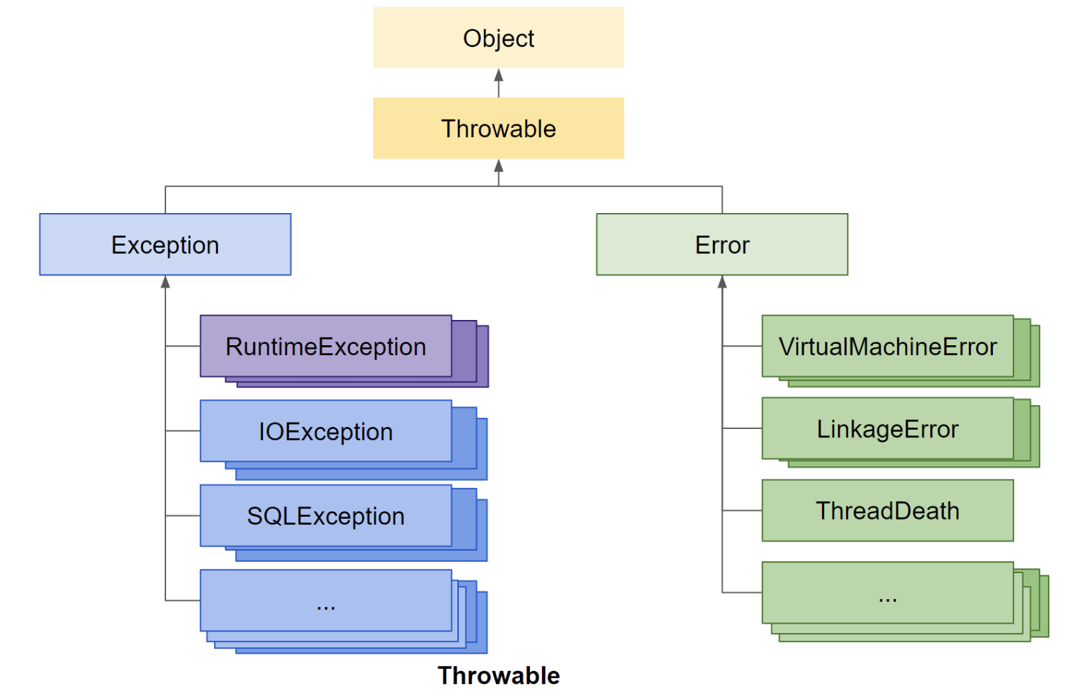(1) Exception, Error 클래스들은 모두 Throwable 클래스를 상속받는다. 이러한 Throwable 클래스는 이러한 예외들을 다룰 수 있는 최상위 클래스이다.