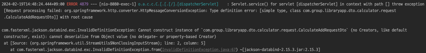 - 처음에 본인도 기본 생성자를 넣어주지 못했다. 이후 InvalidDefinitionException 예외가 발생했으며 예외 메시지를 해석해 봤을 때 CalculateAddRequestDto 해당 객체를 대상으로 기본 생성자가 없고, 객체의 값을 직렬화할 수 없다는 내용이 보였고 Jackson 라이브러리에서 문제가 생긴 것으로 짐작할 수 있었다. 이를 기반으로 구글링해서 찾아보니 다음과 같은 사실을 알 수 있었다.