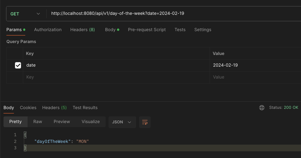 (1) 포스팅 작성 일자를 기준으로 쿼리 파라미터를 전송하는 경우 아래와 같이 금일 일자인 월요일 정보가 정확하게 반환됨을 확인할 수 있다.
